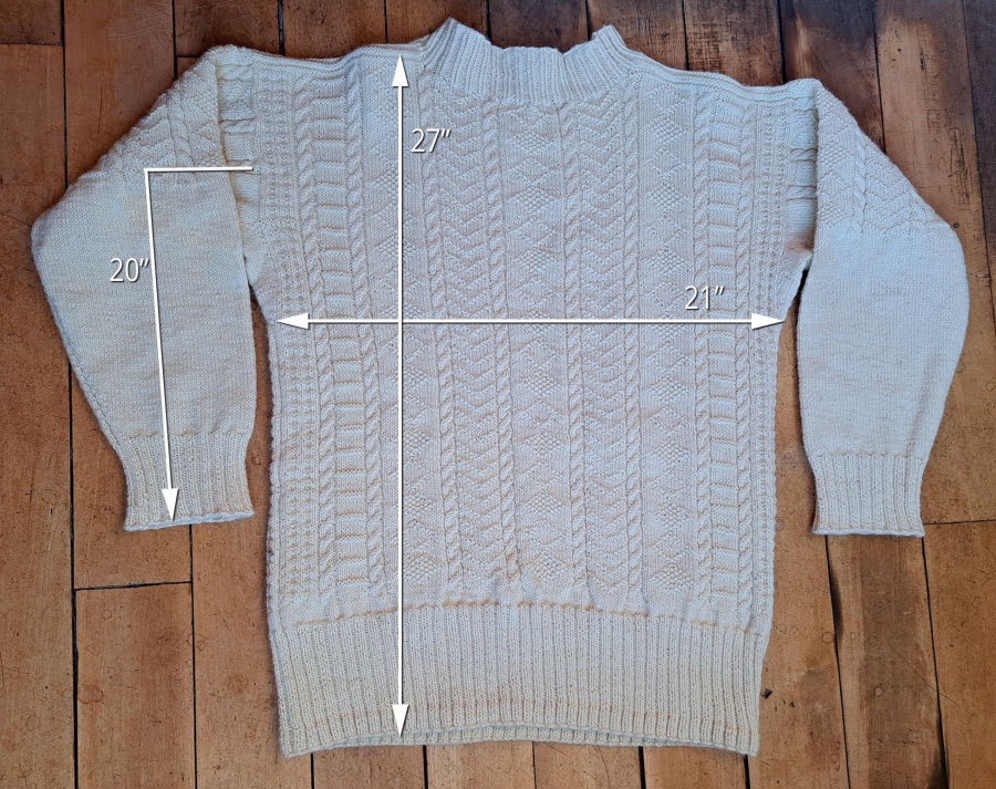 We have another Gansey hand- knitted in one piece available for immediate dispatch. This is the classic “Filey” pattern in cream (aran) 5-ply worsted wool. When knitters approach us we always require a test Gansey before they can start on commissions and, this example, although very nicely knitted, is not quite the knitting tension we aim for. Also, the aran wool tends to be slightly softer as it has not been through as many dyeing processes. This combination means that this Gansey is not as tight as we require. The Gansey measures 21 inches across when laid flat but, due to the lesser tension will comfortably stretch well beyond this and will expand to an overall size of approximately 46 or even 48 inches. The overall length (excluding the small stand-up neck) is 27 inches and the sleeve length is 20 inches. The Gansey is priced at £400.00 plus postage (please add 10% for orders to the U. S. following the introduction of tariffs). Please contact for further details: 01262 850943 or gm@flamboroughmanor.co.uk